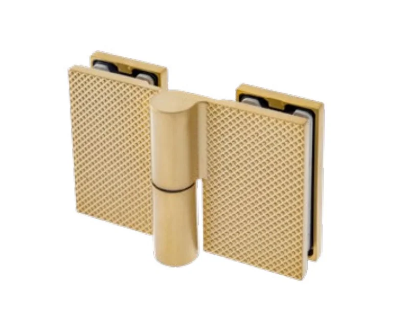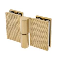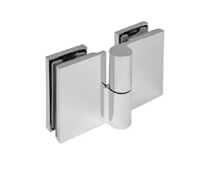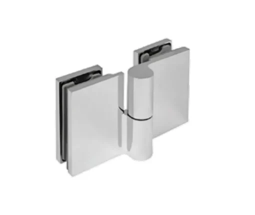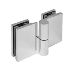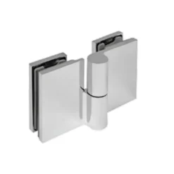 Zawias ETNA w konfiguracji szkło-szkło 180° — łączy dwie tafle szkła bezpośrednio, umożliwiając pełne otwarcie drzwi w obu kierunkach. Idealny do kabin dwudrzwiowych, parawanów przejściowych i konfiguracji narożnych z otwarciem w każdą stronę.