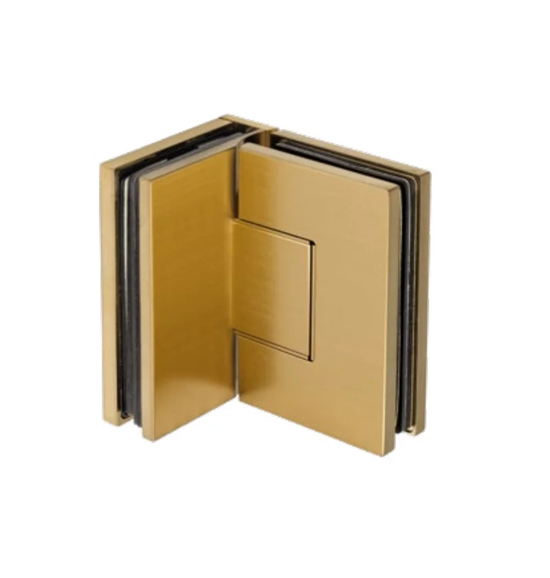 TGAH824 to wariant linii VENEZIA II do montażu szkło-szkło z kątem otwarcia 90° — konstrukcja przeznaczona dla kabin narożnych, gdzie dwie tafle szkła spotykają się pod kątem prostym, a drzwi otwierają się w jednym określonym kierunku. Zawias mocowany bezpośrednio między dwoma taflami.